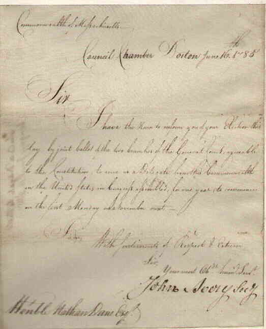 Commonwealth of Massachusetts Council Chamber. Boston. | John Avery | June 16, 1785 | Transcription | |