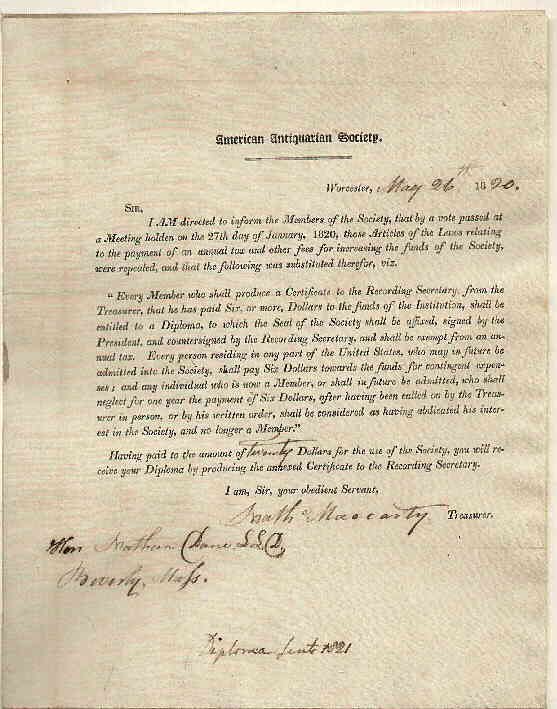 American Antiquarian Society | MacCarthy, Treasurer | May 26, 1820 | ||